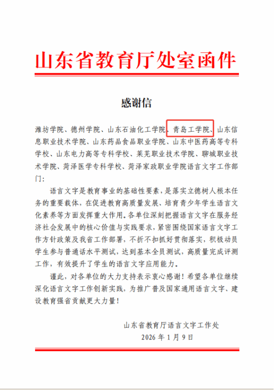 近日,山东省教育厅语言文字工作处向我校发来感谢信,信中指出,我校紧密围绕国家语言文字工作方针政策及我省工作部署,积极动员学生参与普通话水平测试,实现了基本全员覆盖,并高质量完成了评测工作,有效提升了学生的语言文字应用能力。