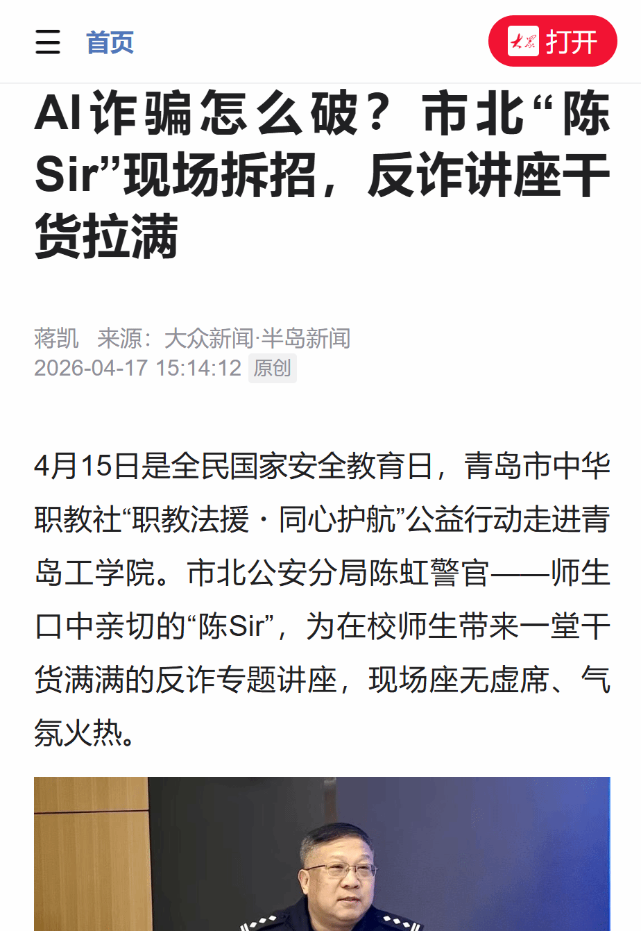 《大众网》丨 AI诈骗怎么破?市北“陈Sir”现场拆招,反诈讲座干货拉满
