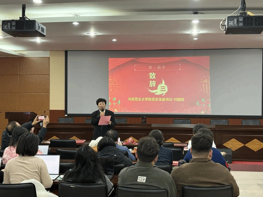 第三篇章“展望未来”,学院党总支副书记付国花作总结致辞。她指出,2026年作为“十五五”规划的开局之年,更是学院深化内涵建设、实现跨越式发展的关键之年。她向全体教职工发出号召,要以更高政治站位把准思政育人方向,以更实工作举措提升立德树人成效;学院党组织也将持续强化引领、做好坚实后盾,为各项工作开展提供全方位保障。