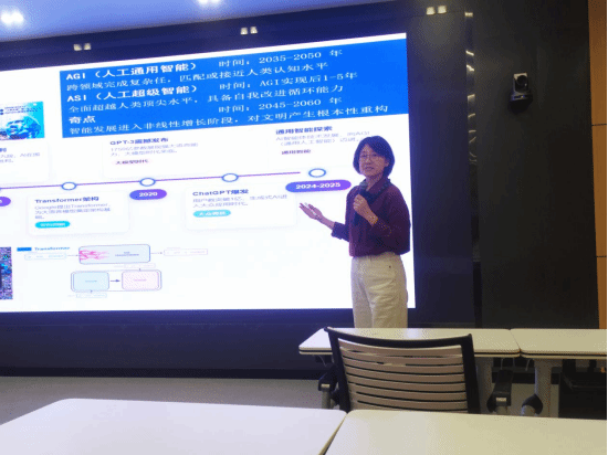 姜教授首先回顾了人工智能的发展历程。她从早期的ENIAC、深蓝,到近年来的AlphaGo、GPT-3,系统梳理了AI从专用任务处理向通用语言理解与生成的演进。她指出,大语言模型凭借其庞大的参数规模与海量语料库,正在重塑人类与机器的交互方式,也为教育内容生成与个性化学习提供了技术基础。