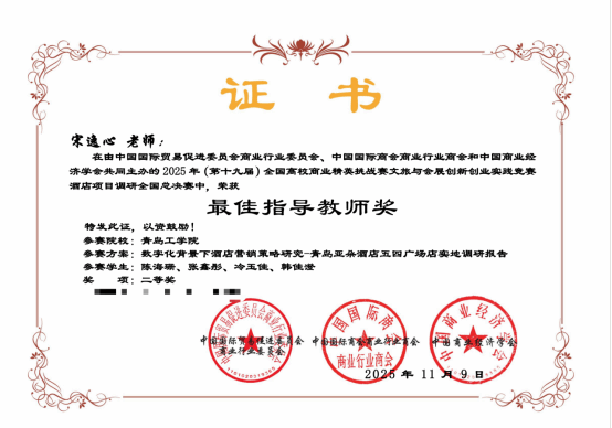 近日,第十九届全国高校商业精英挑战赛文旅与会展创新创业全国总决赛圆满落幕,我校经济管理学院组织的3支学生团队斩获全国总决赛二等奖1项、三等奖2项,青岛工学院荣获“最佳院校组织奖”,韩鑫彬、宋逸心、张淑红获得最佳指导教师奖。