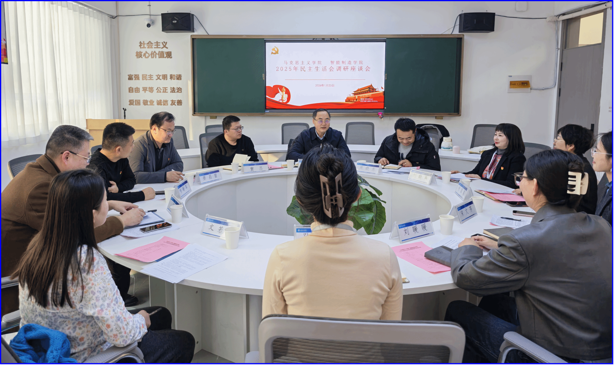 2026年1月23日,学校在美育中心M213召开马克思主义学院与智能制造学院民主生活会调研座谈会。马克思主义学院党总支书记周晓东,副院长刘晓燕、宋文芳,党总支副书记付国花、中国近现代史纲要教研室主任刘暖暖,智能制造学院党总支书记姜昌雷、党总支副书记陈敏军、团总支书记文若思、教工党支部书记王磊、电气工程及其自动化教研室主任孙舒舒参加会议,校党委书记李军主持会议。