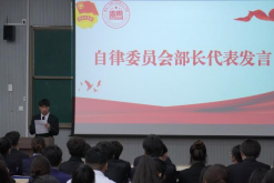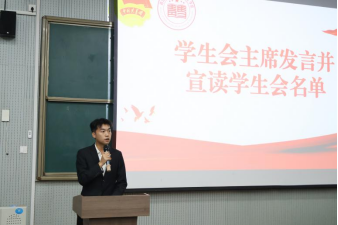 学生会副主席郑锦浩上台发言并宣读了新一届学生会成员名单,明确了学生会各部门的职责与分工。