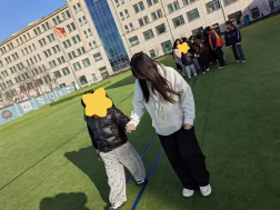最后是最受欢迎的“呼啦圈大闯关”环节,学生们纷纷蹲下身,与孩子保持平视,手把手示范“从头顶缓缓套入、沿身体下滑至脚边”的完整动作。针对动作生疏的小朋友,学生特意放慢引导节奏,将动作拆解为抬胳膊、套圈、顺身下滑等步骤,一边手把手辅助、一边轻声鼓励:“慢慢来,跟着我一起抬胳膊,很棒哦!”在耐心引导下,孩子们从最初的手忙脚乱、不知所措,逐渐掌握动作技巧,顺利完成闯关。挑战过程中,孩子们的肢体控制力与身体协调性稳步提升,自信的笑容也在一张张稚嫩的脸上慢慢绽放。