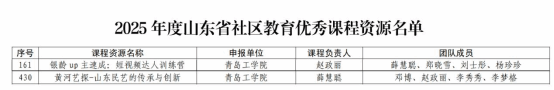 近日,山东省教育厅发布2025年度山东省社区教育优秀课程资源遴选结果公示,设计传媒与艺术学院申报的《银龄up主速成:短视频达人训练营》《黄河艺探——山东民艺的传承与创新》两门课程成功入选,获评为省级社区教育优秀课程资源。