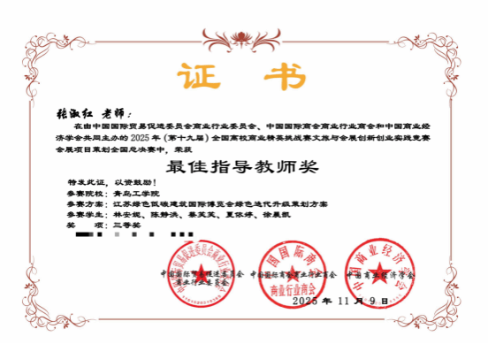 近日,第十九届全国高校商业精英挑战赛文旅与会展创新创业全国总决赛圆满落幕,我校经济管理学院组织的3支学生团队斩获全国总决赛二等奖1项、三等奖2项,青岛工学院荣获“最佳院校组织奖”,韩鑫彬、宋逸心、张淑红获得最佳指导教师奖。