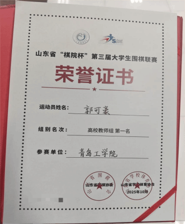 近日,山东省“棋院杯”第三届大学生围棋联赛在中国石油大学(华东)校区落幕。青岛工学院通识教育学院郭可豪老师,成功卫冕高校教师组冠军,这也是他连续两届斩获该组别荣誉。本次赛事亦是学校首次带领青岛工学院学生参赛,为学校开启高校围棋赛事征程。