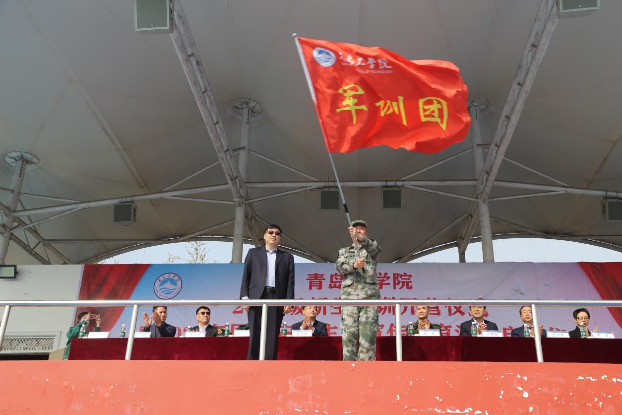 青岛工学院党委书记周有波为军训团授旗,随后军训团总教官王晓奇向各连队授旗。