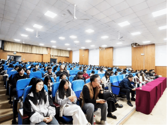 继首期班圆满结业、喜获政企校多方认可后,2025年11月11日,青岛工学院商务外语学院在2105报告厅举办丝路电商英才班(第二期)宣讲启动会。青岛亚欧智贸商业运营管理有限公司CEO孙萌,企业导师王镔、陈可祺,商务外语学院党总支副书记徐晓燕及三四年级学生共计300余人参加活动,现场座无虚席,互动热烈。