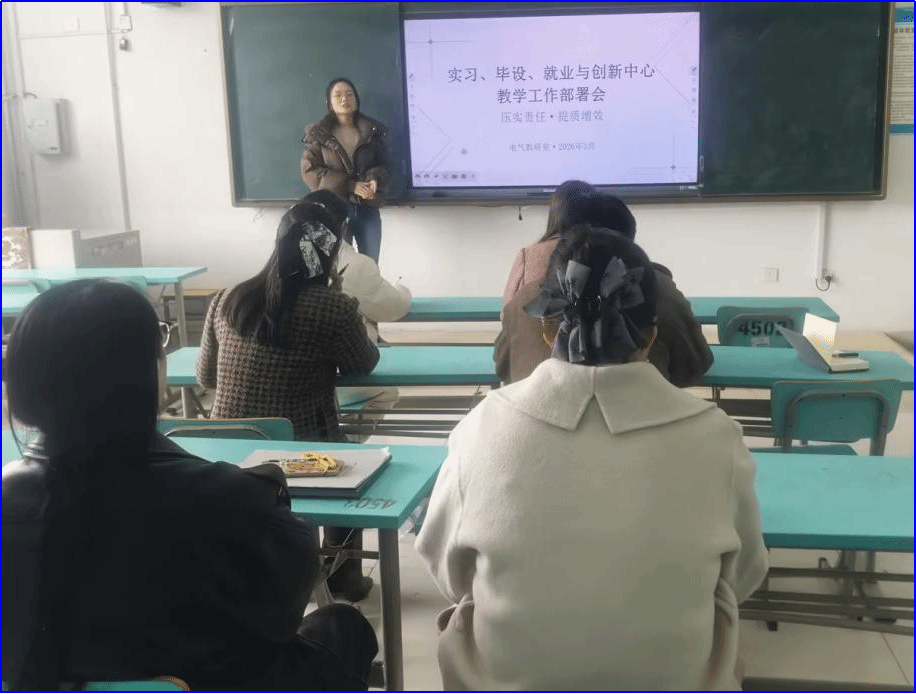 为扎实推进毕业生实习、毕业设计、就业服务及创新中心教学落地,统筹做好学期中期重点教学与学生管理工作,3月25日,电气工程及其自动化教研室召开毕业生实习、毕设、就业与创新中心教学工作部署会。会议由教研室主任孙舒舒老师主持,教研室全体教师参会,明确任务、压实责任,确保各项工作有序高效推进。