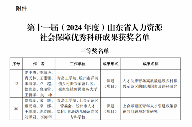 近日,山东省人力资源和社会保障厅公布了第十一届(2024年度)山东省人力资源社会保障优秀科研成果评选结果,青岛工学院喜获课题(项目)类三等奖2项,标志着学校在人力资源社会保障与地方发展融合研究领域取得重要突破,为区域高质量发展提供智力支撑的能力得到省级权威认可。
