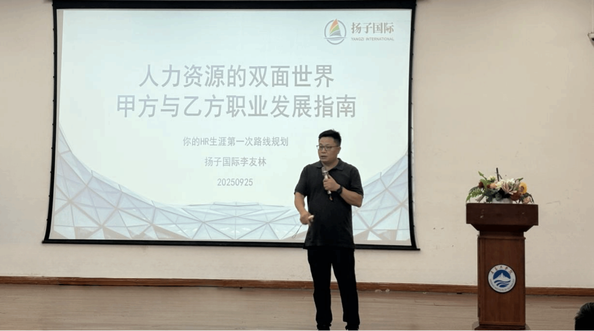 李友林以《人力资源的双面世界——甲方与乙方职业发展指南》为题,结合扬子国际及海信等企业案例,系统解析了人力资源六大模块、甲方与乙方岗位差异、人力资源从业者的市场需求、人力资源从业者必备能力及对学生的职业建议等几个方面,他建议同学们熟悉相关法律法规,提升核心专业能力、通用软技能、工具应用能力、以及思维与意识等,持续提升专业价值。