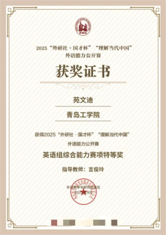 近日,2025年外研社・国才杯“理解当代中国”英语综合能力公开赛传来捷报。我校商务外语学院学子凭借过硬的专业素养与昂扬的竞技状态奋勇争先,不仅在全国赛事舞台上斩获多项亮眼成绩,更实现了学院在该赛事中的历史性突破——学院学子苑文迪凭借扎实的英语语言功底、深刻的赛事主题理解能力,在众多参赛选手中脱颖而出,首次为学院斩获该赛事最高荣誉“特等奖”,成功填补了我院在该赛事特等奖领域的空白,为学校与学院赢得了重要荣誉。
