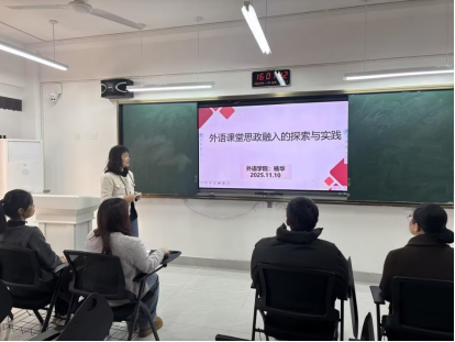 为深入推进外语课堂思政建设,切实提升青年教师思政元素融入教学的实践能力,11月10日下午4时,商务外语学院杨华副教授在1210教室主讲“外语课堂思政融入的探索与实践”专题讲座。我院英语、俄语专业全体青年教师参加本次培训,共同探讨思政与外语教学深度融合的有效路径。