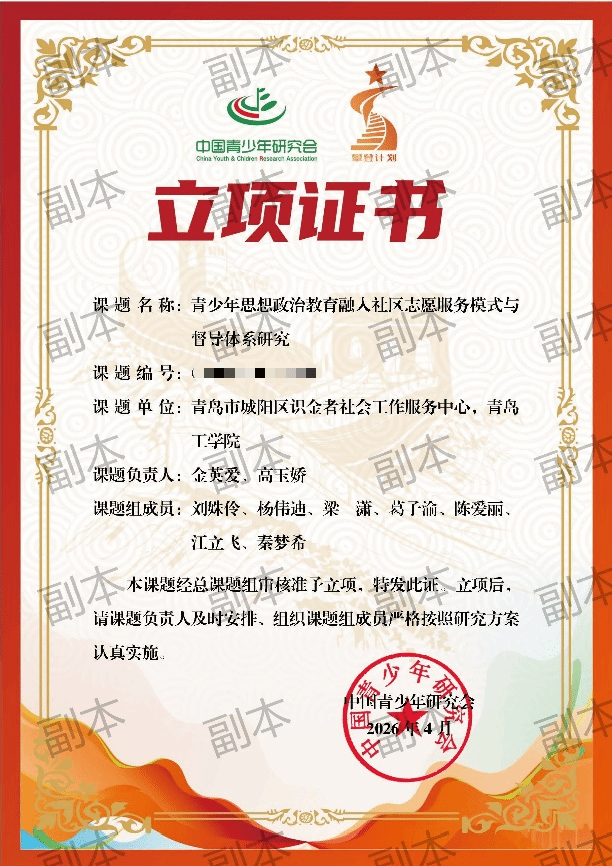 近日,中国青少年研究会公布《“攀登计划”——新时代青少年思想政治教育研究暨“十五五”开题立项课题》评审结果。青岛工学院马克思主义学院金英爱、高玉娇两位老师联合城阳区识金者社会工作服务中心申报的课题,成功获批立项。此次立项,不仅是学院社会工作专业教师在青少年思想政治教育科研领域的新突破,更标志着学校在深化产教融合、推动产学研协同创新发展方面取得了关键进展,彰显了专业教学与社会服务深度融合的丰硕成果。